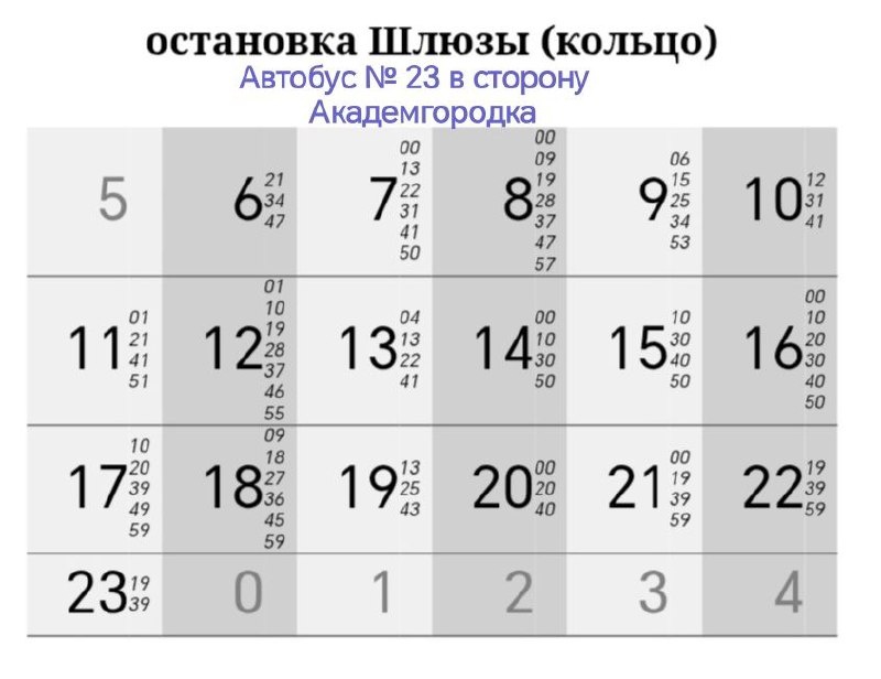 ? На сайте ЦУГАЭТ в связи с увеличением машин в утреннее время обновили расписание автобуса № 23. Согласно ему, более ранним, в 6:21, стал первый выход с кольца Шлюза в сторону Академгородка и далее примерно каждые 13 минут, а с 7 до 9 часов - почти каждые 10 минут. Напоминаем, что сдвижка первого выхода на более раннее время и увеличение количества утренних автобусов произошло после обращения в департамент транспорта депутата дружественного микрорайона ОбьГЭС Антона Бурмистрова, за что ему огромное Спасибо! Делитесь - помогли ли такие решения? Легче стало уезжать?