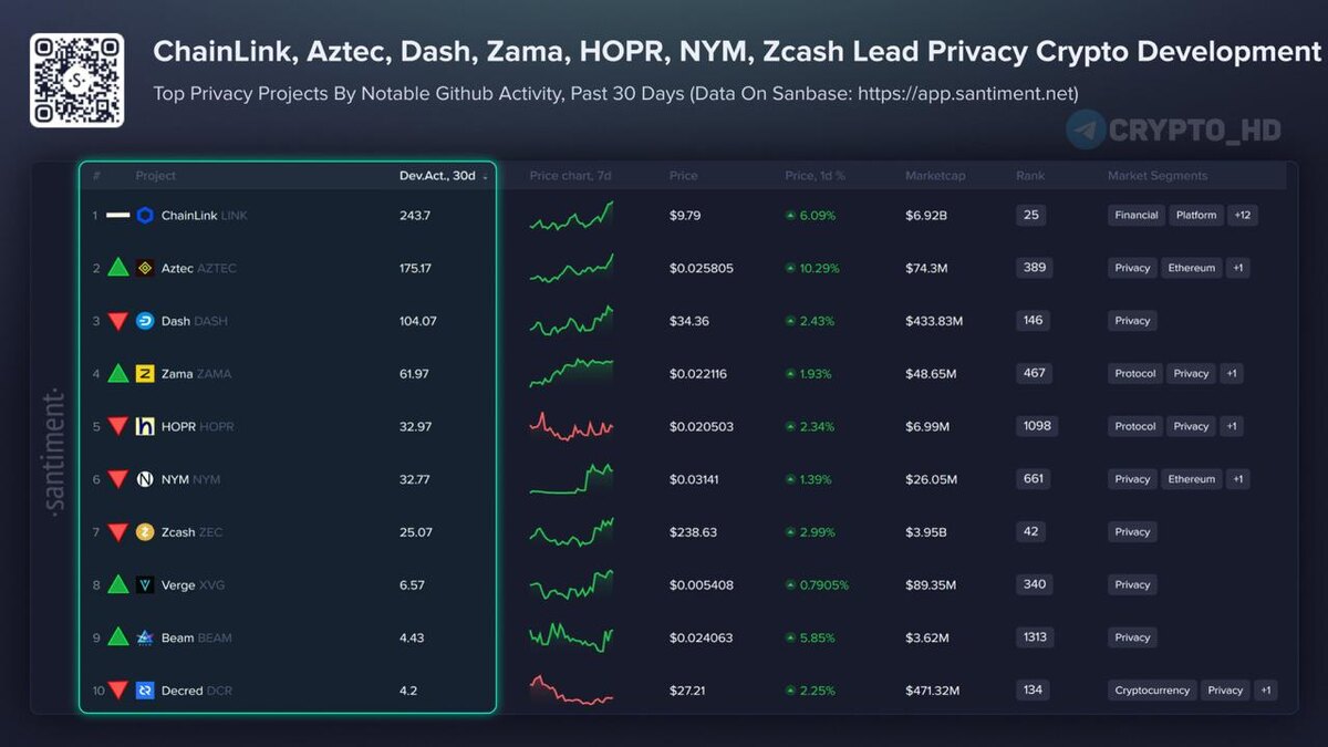 📊 Santiment: ТОП-10 криптопроектов, ориентированных на конфиденциальность (Privacy), по активности разработчиков за последние 30 дней. 1. ChainLink #LINK 2. Aztec #AZTEC 3. Dash #DASH 4. Zama #ZAMA 5. HOPR #HOPR 6. NYM #NYM 7. Zcash #ZEC 8. Verge #XVG 9. Beam #BEAM 10. Decred #DCR Ранее: прошлый топ Crypto Headlines
