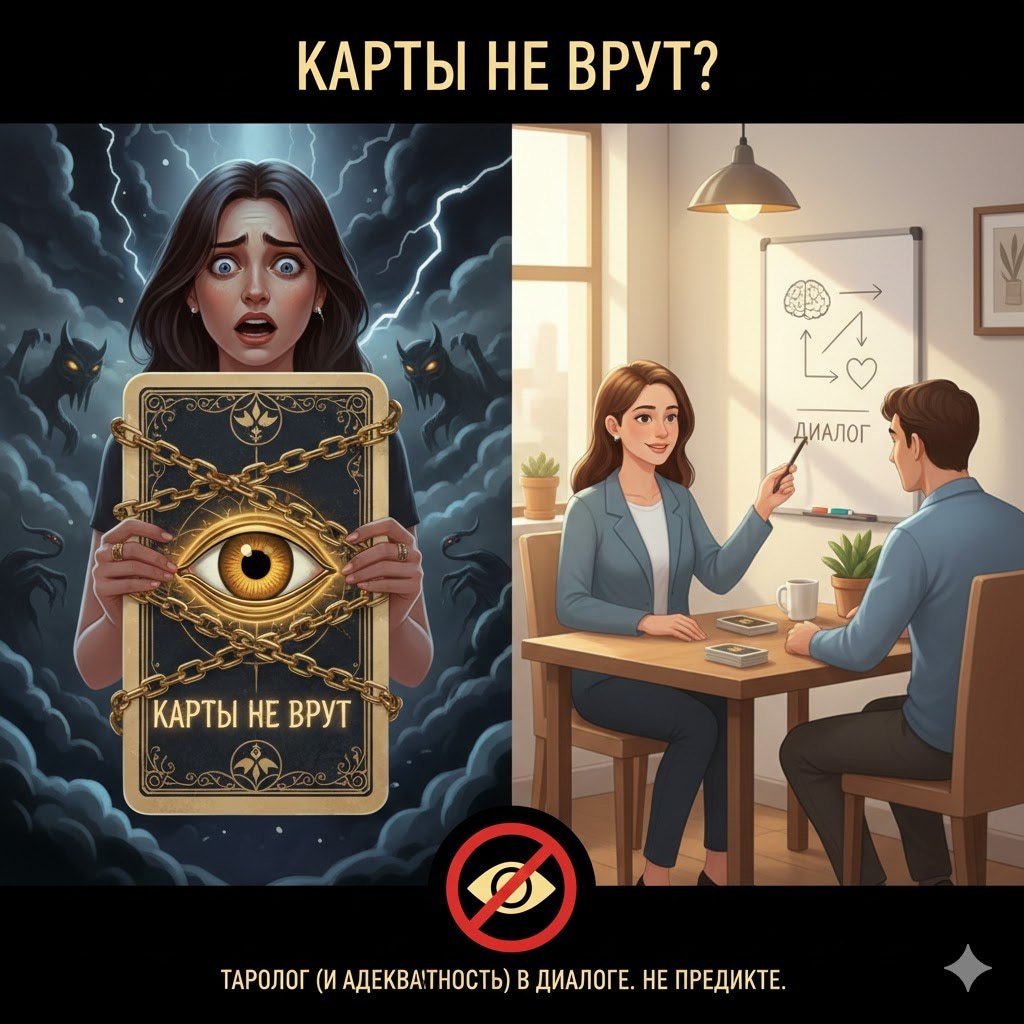 Вы наверняка это слышали. А может, и сами говорили. «Не переживай, карты не врут». Звучит как мантра. Как будто сама Вселенная взяла трубку и сказала: «Я подтверждаю, всё чисто, претензий не имею». 🕯️ Но давайте честно. Карты — это просто картонки с картинками.