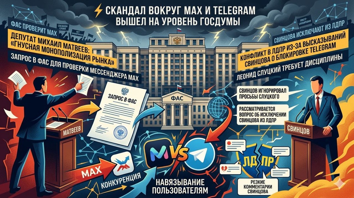 Депутат Госдумы Михаил Матвеев раскритиковал продвижение нового мессенджера MAX, назвав его «гнусной монополизацией рынка». Он считает, что сервис навязывается пользователям, и направил запрос в Федеральную антимонопольную службу России для проверки нарушений. Параллельно обострился конфликт вокруг заявлений о блокировке Telegram. Депутата Госдумы РФ Андрея Свинцова могут исключить из ЛДПР из-за резких публичных комментариев. По данным СМИ, лидер партии Леонид Слуцкий неоднократно просил Свинцова не высказываться на эту тему, однако тот проигнорировал просьбы, что и привело к конфликту. Распространение материалов допускается только с указанием ссылки на источник. 🤩 PRO News: мы там, где вы!