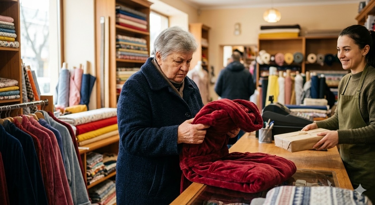 Алевтина остановилась у стойки с готовыми халатами. Тёмно-вишнёвый — мягкий, тёплый. Провела рукой по ткани.