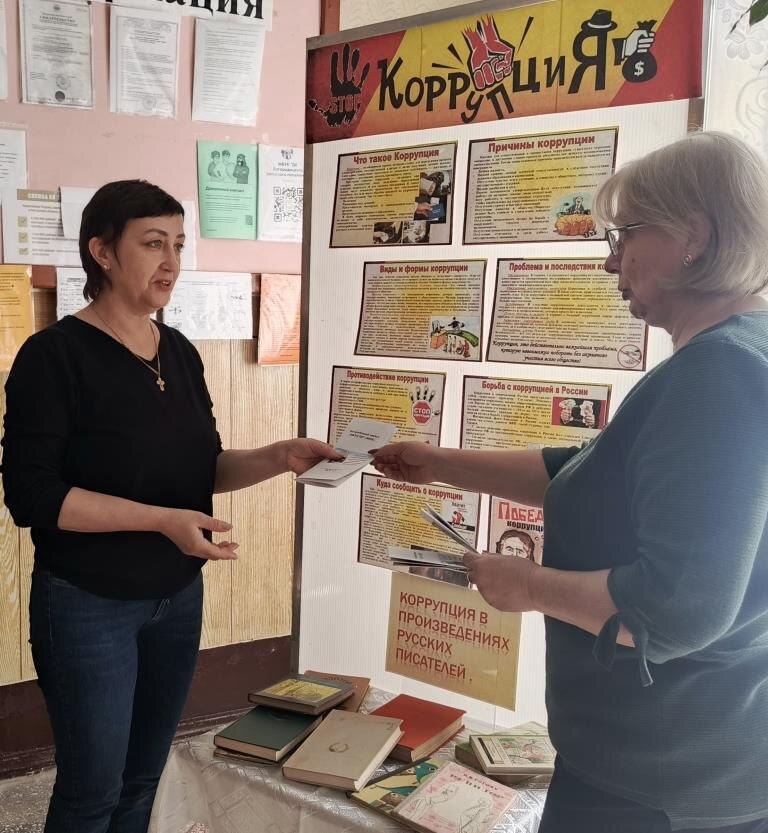 Борьба с коррупцией – это одна из основных проблем современности, которую нужно решать. С целью проведения информационно-разъяснительной работы среди населения, в Песчанокопской МЦБ прошли мероприятия. В Богородицком отделе оформлен информационный стенд «STOP Коррупция». На стенде представлены информационные материалы по данной теме. Всем читателям, пришедшим в этот день в библиотеку, библиотекарь представляла для ознакомления книжную выставку и буклеты «Проблема коррупции в произведениях русской классической литературы».