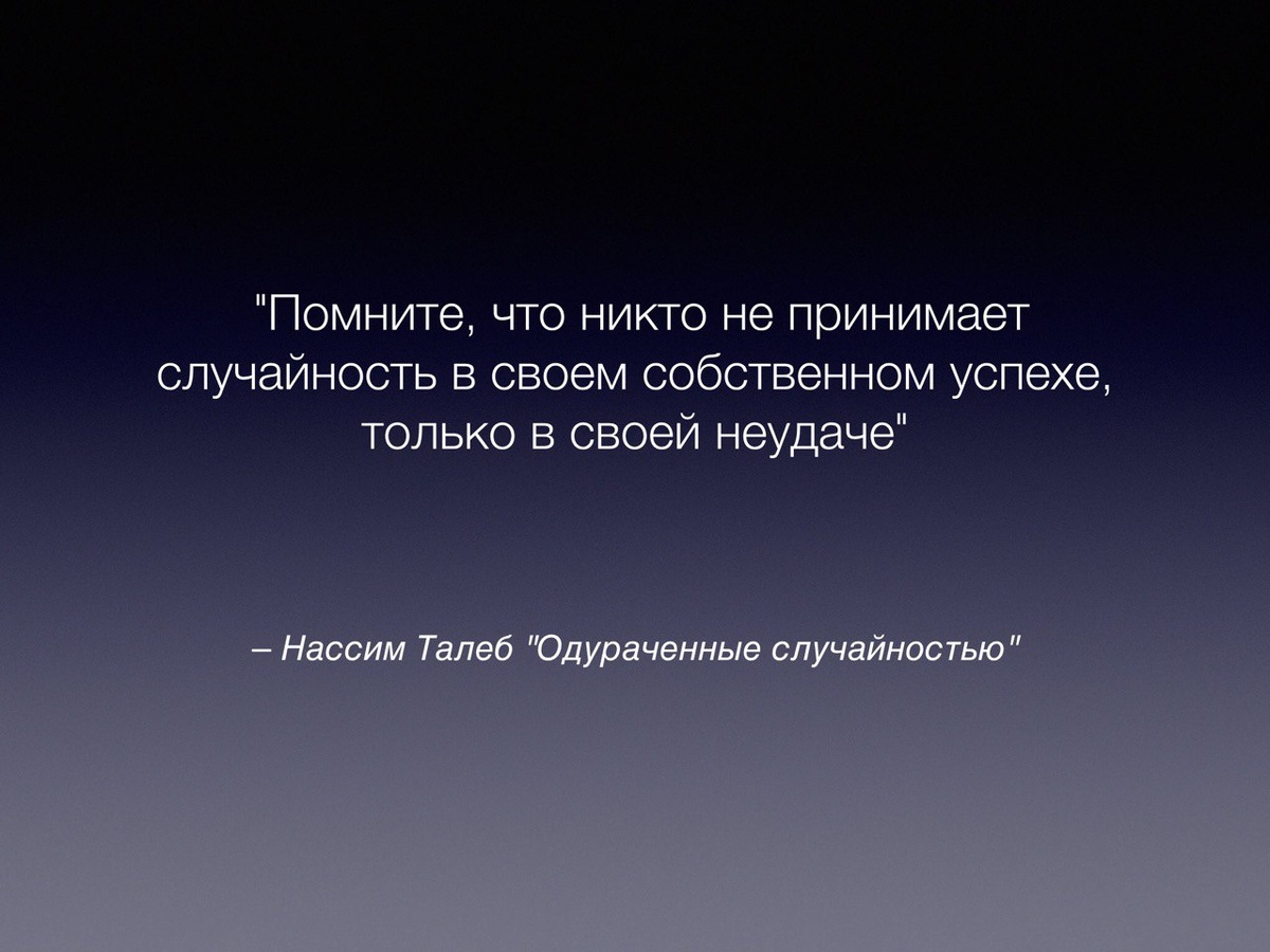 Руководители привыкли связывать ошибки с нехваткой информации или компетенций. Однако наблюдения Нассима Талеба указывают на более глубокий уровень — искажения в самом способе мышления. Переговоры и сделки чаще всего проваливаются из-за неправильной интерпретации неопределённости, когда происходит смешивание вероятности и ожидаемой выгоды, переоценивается степень контроля над ситуацией и недооценивается роль случайности. Эти 12 цитат Талеба позволяют иначе посмотреть на собственные решения и заметить те искажения, которые обычно остаются вне внимания. Особенно ясно это проявляется в переговорах, управлении и стратегических решениях, где цена ошибки зачастую выше, чем кажется в момент выбора. 1. «Помните, что никто не принимает случайность в своём собственном успехе, только в своей неудаче» 2. «Много людей женятся на своих идеях на своём пути к могиле» 3. «Вещи, приходящие с меньшей помощью удачи, более устойчивы к случайности» 4. «Чем больше данных мы имеем, тем вероятнее, что мы