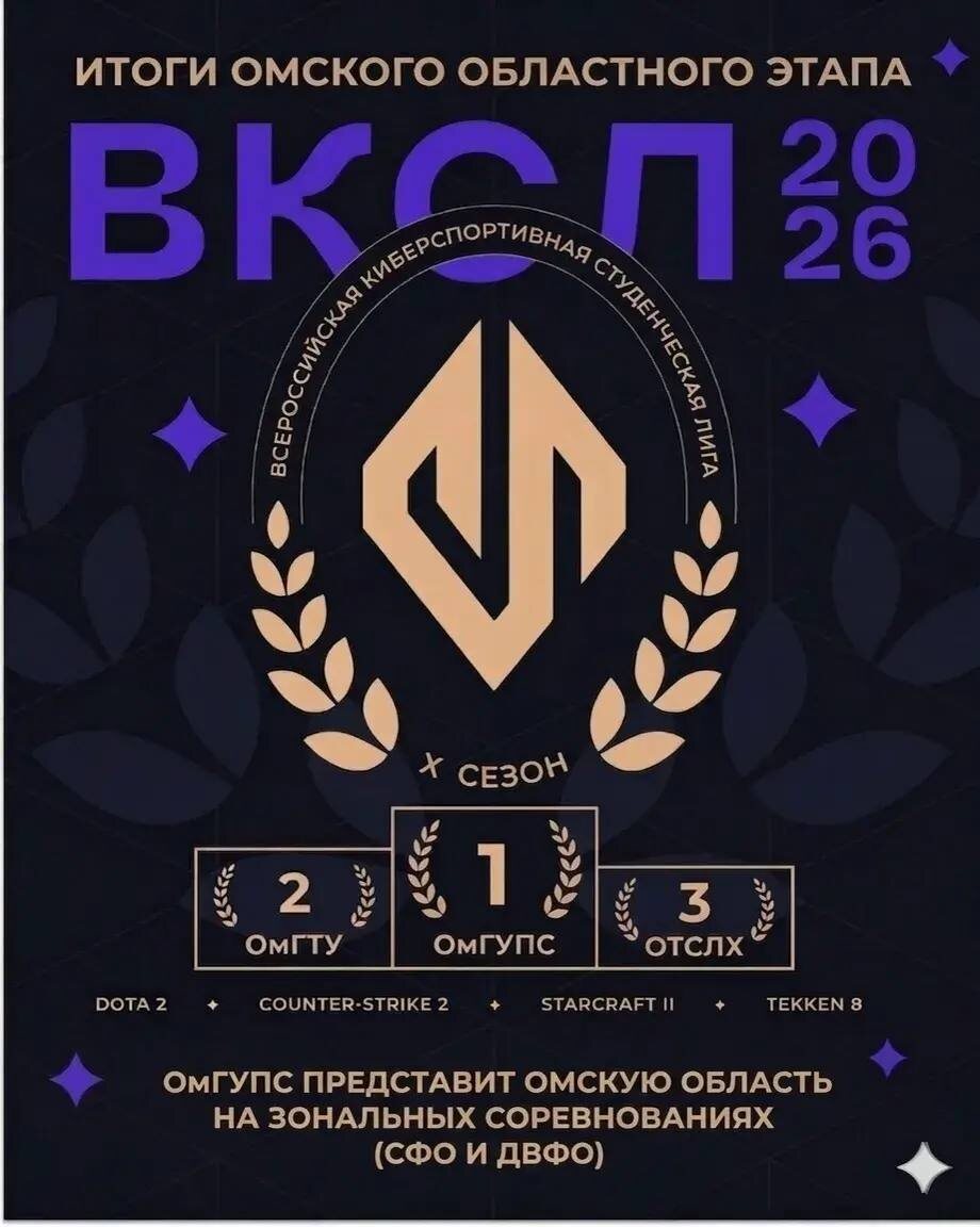 Право представлять свой регион на зональном турнире завоевала команда ОмГУПСа. В Омске состоялся региональный этап Всероссийской киберспортивной студенческой лиги. В состязаниях принимали участие сборные образовательных организаций по 4 видам программы: «Dota 2», «Counter-Strike 2», «Starcraft 2», «Tekken 8». Победителем соревнований стала дружина Омского государственного университета путей сообщения (ОмГУПС), именно она будет представлять наш регион на зональном этапе, где встретятся команды Сибирского и Дальневосточного федеральных округов. Проведение зональных соревнований запланировано с 21 по 28 марта в онлайн-формате.
