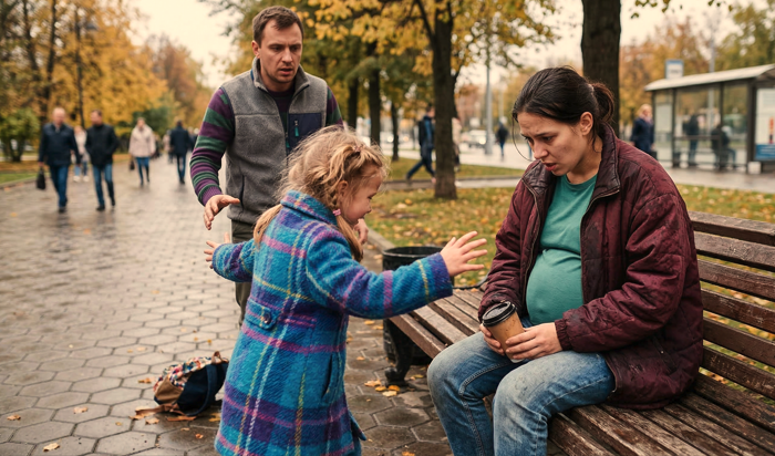 Октябрьский ветер пробирал до костей. Тимур зябко поднял воротник кашемирового пальто, глядя, как его семилетняя дочь Ксюша вдруг срывается с места и бежит к старой деревянной скамейке у неработающего фонтана. Там, съежившись от холода, сидела женщина. На ней была бесформенная, явно с чужого плеча куртка, под которой отчетливо выпирал огромный живот. В покрасневших пальцах она сжимала бумажный стаканчик.