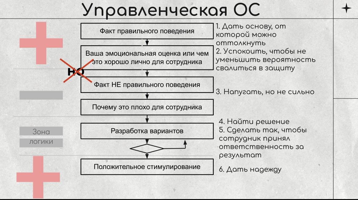 Прежде, чем рассказывать сотруднику, в чем и как ему стоит поменяться, обязательно рассказываем, что он уже делает правильно. Это даст ему ощущение, что нужно подправить только часть, а не переделать всё на корню. Дальше стимулируем у сотрудника желание измениться. Для этого задаем "минус", продолжение которого невыгодно сотруднику, а значит ему выгодно измениться. Далее переходим в блок логики, где обсудить, куда и как будет выполняться изменение. В завершении закрепляем желание поменяться, давая надежду на лучшее будущее, что будет поддерживать мотивированность сотрудника продолжать изменения. Важно при этом сопровождатьвсе свои оценки фактом или прогнозом Приведу пример с первоклассницей дочкой по прикрепленной схеме. У меня как родителя задача - вызвать интерес и желание ежедневно читать книгу перед сном, чтобы научиться читать бегло. 1. Ника! Ты учишься в 1 классе муниципальной школы, посещаешь еженедельные занятия в школе IQ007, выполняешь все домашние задания под присмо