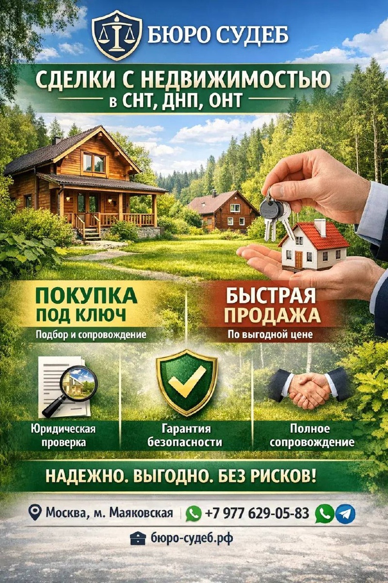 Планируете покупку или продажу загородной недвижимости? Юридическое бюро «Бюро Судеб» предлагает полный комплекс услуг по подбору, проверке и реализации земельных участков и домов в Московской области и смежных регионах. Мы избавляем вас от рисков и бюрократической нагрузки, обеспечивая юридическую чистоту и финансовую выгоду каждой сделки. --- 🏡 Для покупателей: Подбор и сопровождение «под ключ» Мы поможем найти идеальный объект, соответствующий вашим критериям и бюджету: 1. Индивидуальный подбор: Анализируем ваши требования (площадь, назначение, инфраструктура) и бюджет. 2. Эксклюзивная база: Мы работаем с СНТ по всей области, напрямую взаимодействуем с председателями и имеем доступ к предложениям, которых нет в открытом доступе. 3. Переговоры и выгода: Проводим профессиональную оценку стоимости и ведем переговоры с продавцом, добиваясь максимально выгодных условий для вас. 4. Организация показов: Демонстрируем объект и отвечаем на все технические и юридические вопросы на месте.