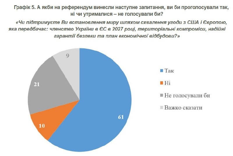 марта. Оригинал здесь: https://www.kiis.com.ua/?lang=rus&cat=reports&id=1594&page=1 В нём достаточно запутанная методология, которую сами авторы опроса разжёвывают дважды, и поэтому большинство графиков из него не особо важны, кроме последнего. Суть в том, что опрос проводился не «в лоб», украинцев спрашивали не «готовы ли вы сдать Донбасс в обмен на мир» — хотя такой опрос тоже был, его опубликуют отдельным релизом, — а задавали несколько вопросов: ▪️Хотите ли вы референдум; ▪️Пойдёте ли вы на референдум; ▪️Как бы вы проголосовали на таком референдуме. И так далее. Если спрашивать прямо, то большинство украинцев отказываются «сдать Донбасс», на середину февраля 57% выступали категорически против и лишь 36% неохотно, но за. Однако если спросить: «Поддерживаете ли вы установление мира путем утверждения соглашения с США и Европой, которое предусматривает: членство в ЕС в 2027 году, территориальные компромиссы, надежные гарантии безопасности и план экономического восстановления?», то
