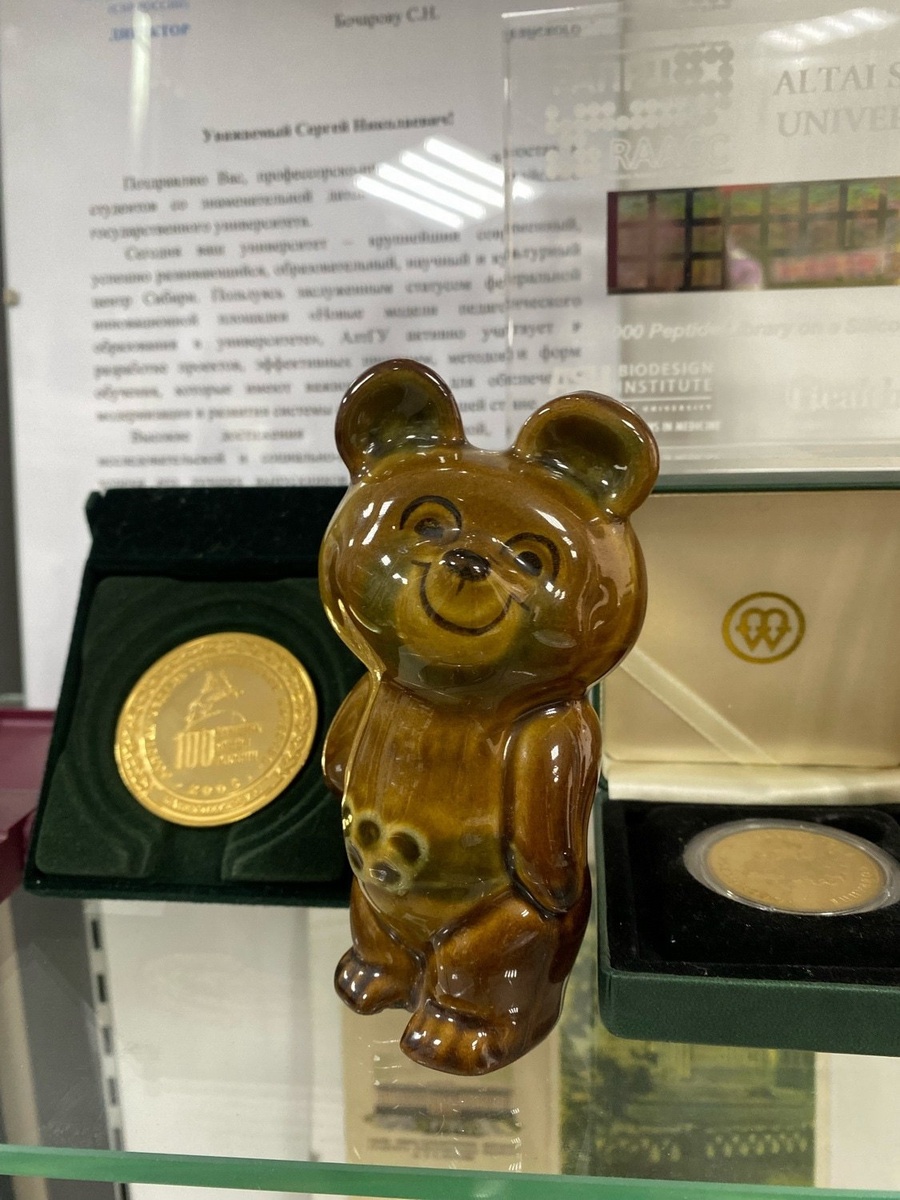 ! В Музее истории Алтайского государственного университета им. В. И. Неверова живет Олимпийский Мишка! Хранитель фондов музея Ксения Бояринцева, аспирантка института истории и международных отношений АлтГУ, рассказывает: 💬– В центральной части музея располагается ректорский шкаф. Здесь представлены фотографии, награды, грамоты действующего ректора Сергея Николаевича Бочарова, переданные нам на хранение. Здесь же затесался и Олимпийский Мишка – фарфоровая статуэтка, изготовленная в ограниченном тираже на Славянском керамическом комбинате и переданная в музей Людмилой Ивановной Базиной – редактором первой категории редакционно-издательского отдела. Автор: Эльвира Петренёва #ЗНновости@zanauku Подпишись: МАХ|ВК