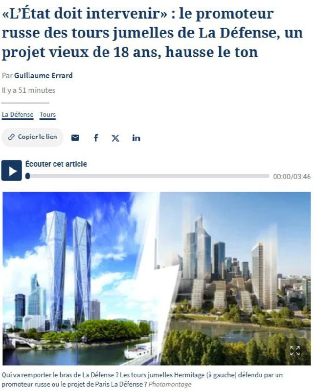 сих пор не реализован. Российский застройщик Emin Iskenderov обвиняет администрацию Paris La Défense в «незаконном поведении», ссылается на действующие судебные процессы по разрешениям на строительство и по соглашениям с городом, и требует вмешательства государства, рассматривая возможность уголовной жалобы и компенсации в 1,3 млрд евро. Тем временем город объявил о новом проекте на месте башен, квартал с жильём, офисами, гостиницами и общественными пространствами вдоль Сены, чтобы сделать район «живым и открытым». 🔺Треугольный метр: На сайте | в MAX | Telegram | ВКонтакте | Дзен