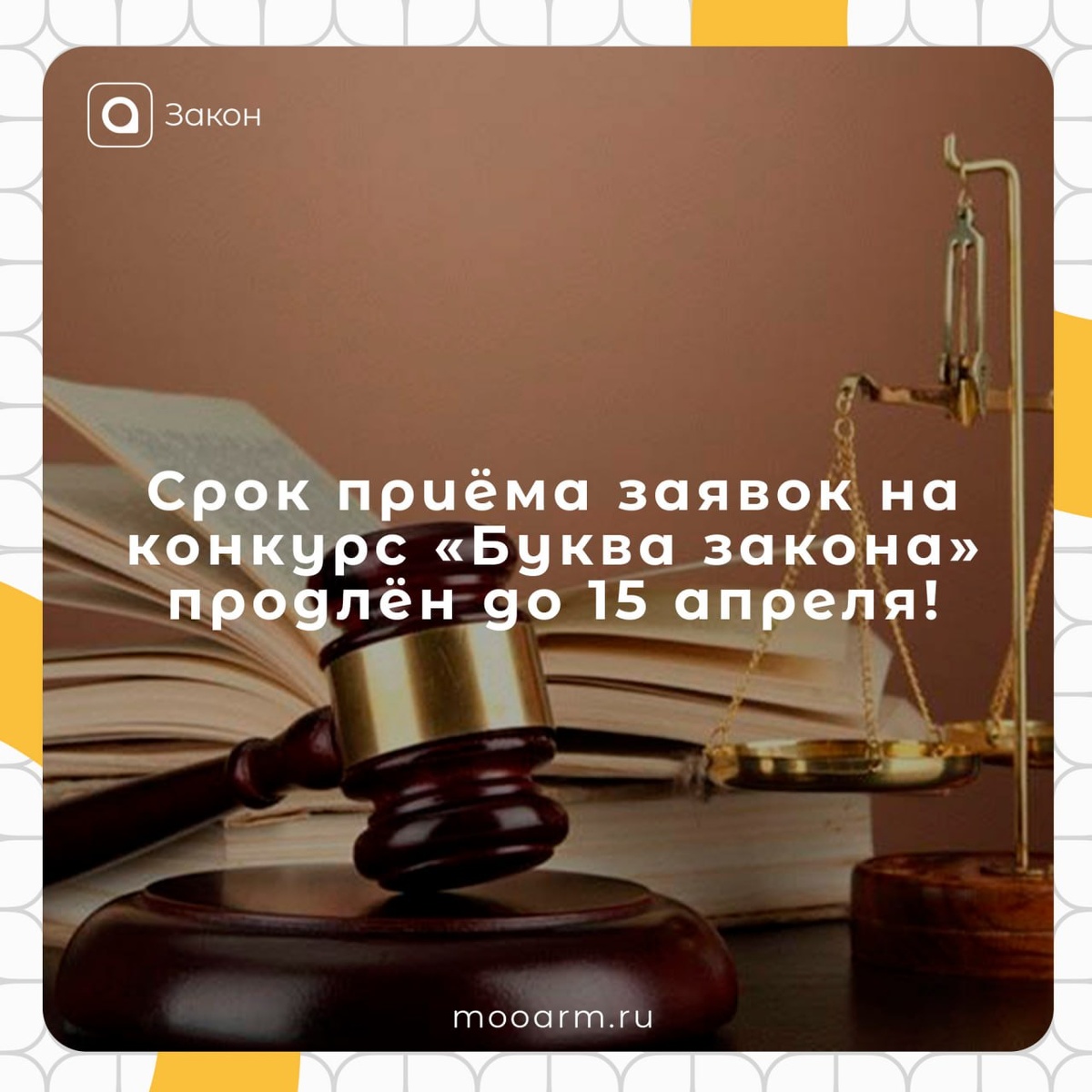 » ⚡️Отличные новости! Мы продлеваем сроки приёма заявок на участие в конкурсе до 15 апреля 2026 года! У вас появилось больше времени, чтобы подготовить свои законотворческие инициативы, собрать команду или доработать проекты. ✅Напоминаем, что конкурс открыт для: — Граждан РФ от 14 до 39 лет — Индивидуальных участников и команд до 5 человек 💡Ваши идеи могут касаться: - Социальной политики; - Образования и науки; - Патриотического воспитания; - Здравоохранения и культуры; - Молодёжной политики; - Экологии и природопользования; - Промышленности; - Регионального законодательства; - Электоральной активности; 🏆Вас ждёт: — Сертификат участника — Диплом победителя — Возможность реализации ваших идей в законодательстве 📧 Подать заявку: Отправить материалы на почту info@mooarm.ru с темой письма «Буква закона» Не упустите свой шанс внести вклад в развитие правовой системы страны! ❤️mooarm.ru❤️ VK | Дзен