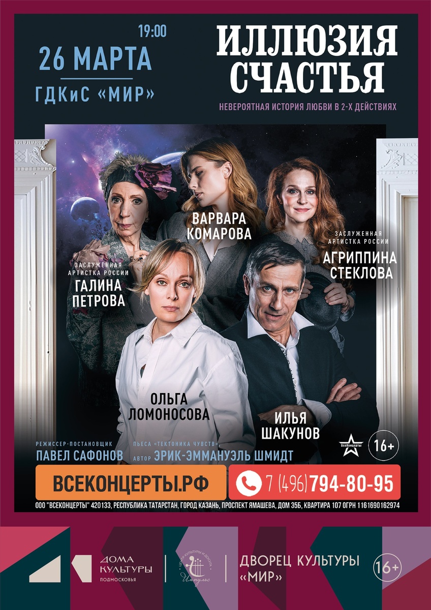 ✨ Спектакль «Иллюзия счастья»🎭 ✨ Диана — счастливая парижанка с идеальной жизнью: карьера, красота, любящий мужчина. Но в один миг всё рушится. Герои оказываются в безумном водовороте страстей, где переплетаются неожиданные разрывы, тайны, обманы и роковые диагнозы. ✨ Непредсказуемая развязка и остроумные, утончённые диалоги держат в напряжении до самого финала. Это любовная история, которую невозможно забыть! 📆 26.03.2026🕒19:00 🏢 Дворец культуры и спорта «Мир» 📍 г. Домодедово, Каширское шоссе, д.100А ✅ Мероприятия Домодедово https://dzen.ru/id/66f10385cc4c5a16f7b5fb02 https://vk.ru/domodedovo_events http://dzen.ru/domodedovo_events