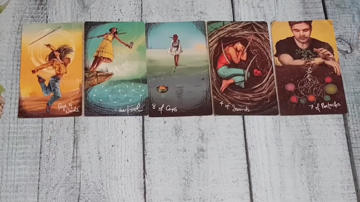 Что происходит в жизни этого Шута? Четвёрка Кубков — ему что-то наскучило. Странно для Шута, который привык к лёгкости. Возможно, он чей-то муж. У него есть обязательства, но он ищет там, где будет любовно, весело, легко. Ему очень быстро всё надоедает, он — ходок. Он не любит тратиться, не любит вкладываться, ищет, где будет весело, здорово, замечательно. Сейчас ему что-то надоело — Четвёрка Кубков: скучающий человек, которого обременили обязанностями. А он бежит от них, как чёрт от ладана.