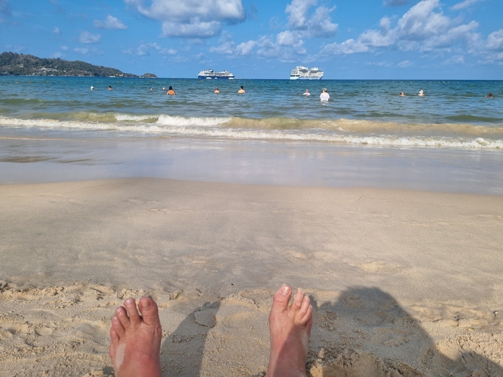 Ну а пока, что ж, была на Пхукете, пляж Патонг, королевство Таиланд. Отель Zephyr Grand. Поскольку поездка была почти спонтанной, ехала одна, пришлось ужаться с отелем – он стоит на 3 линии. Полтора километра до моря. Далековато, но что ж… ноги есть, здоровье позволяет. Старенький отельчик без территории со своими плюсами (кровать шикарна) и минусами, главным из которых было то что приходилось переходить ЧЕТЫРЕ дороги. Ну ладно, серьезная только одна, остальные попроще, две из них и вовсе односторонние, что существенно облегчает процесс… Вод вид с крыши отеля. Море видно? Нет, почти не видно. Но оно есть! Так вот, несмотря на, я отдохнула просто отлично, шикарно, замечательно, лучше не бывает. На третий день снизошло на душу что-то типа нирваны, все плохое унесло море, осталось ощущение незамутненного счастья, довольства и спокойствия. Море… О, море, как же я люблю тебя! Ты всегда разное, утреннее, штормовое, спокойное, прогретое насквозь, соленое, с рыбками, в отлив, в прилив, окраше