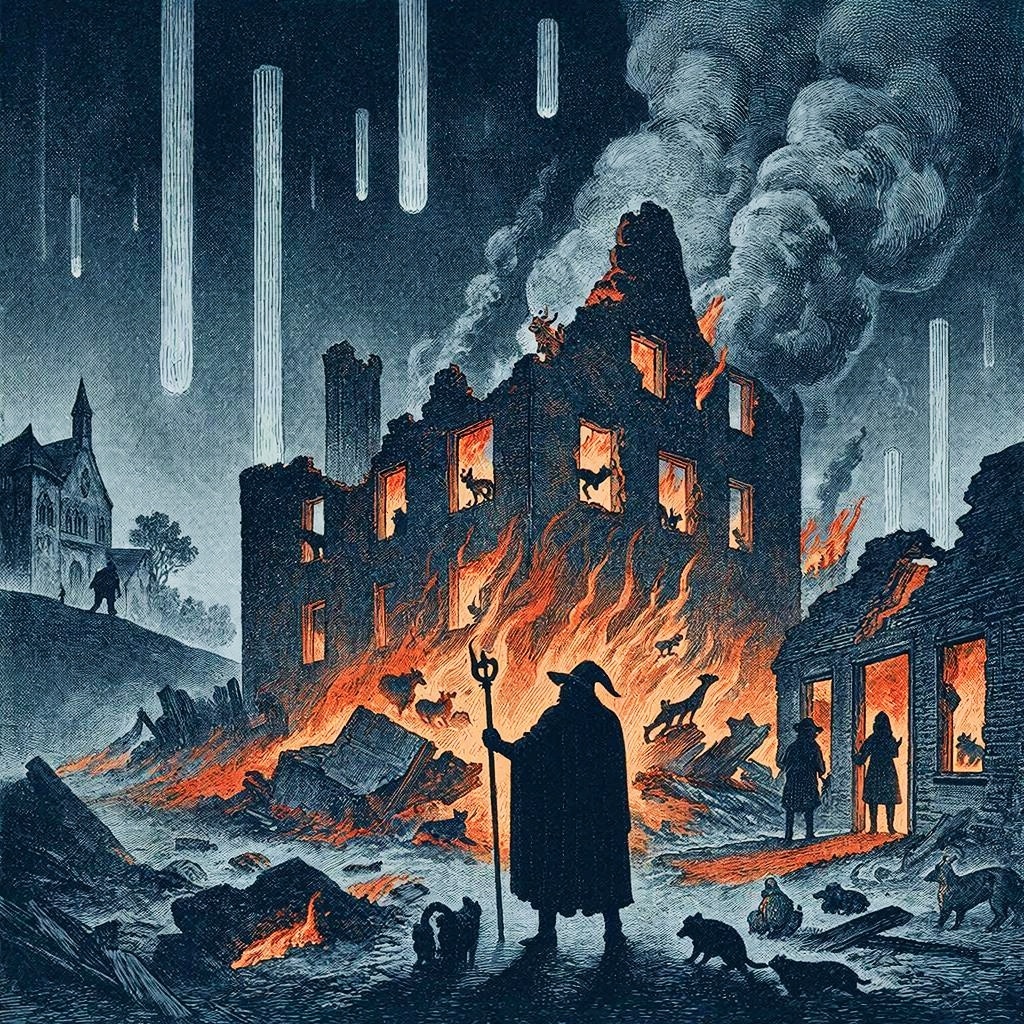 Белбэри горел. Стены рушились, стёкла лопались, лаборатории взрывались одна за другой. А посреди всего этого стоял Мерлин — неподвижный, с посохом в руке. Он не колдовал, не творил чудес. Он просто открыл дверь, в которую вошло то, что давно уже ждало снаружи.