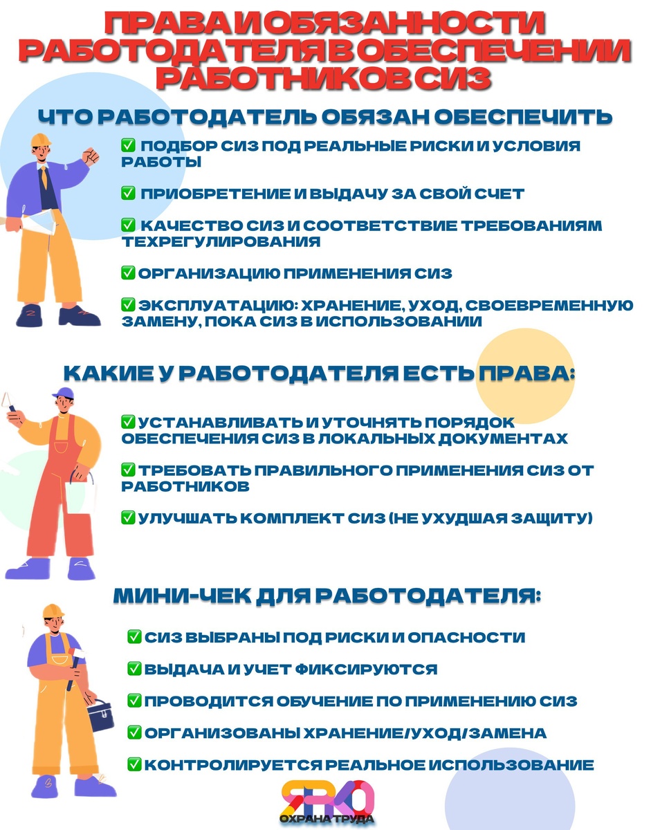 Когда речь заходит о СИЗ, у работодателя есть не только обязанность “выдать”, но и обязанность организовать весь цикл: от определения потребности до эксплуатации и замены. Основные требования закона: ➡️ТК РФ, ст. 214 — работодатель обязан обеспечить безопасные условия труда, включая обеспечение работников СИЗ и смывающими средствами. ➡️Приказ Минтруда № 766н — отдельный раздел «Права и обязанности работодателя» и полный регламент: выбор, выдача, хранение, уход, вывод из эксплуатации, дерматологические и смывающие средства. Что работодатель обязан обеспечить. 1️⃣Подбор СИЗ под реальные риски и условия работы. Основные составляющие: факторы/опасности рабочего места и выполняемых работ. 2️⃣Приобретение и выдачу за счет работодателя СИЗ должны быть надлежащего качества и соответствовать требованиям техрегулирования (сертификация/декларация — где требуется). 3️⃣Организацию применения СИЗ Они должны не просто лежать в месте хранения — работники должны быть обучены и реально применять их в