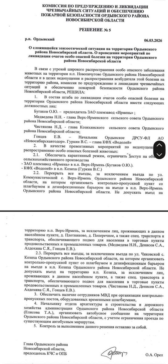 Ей управляет видный единоросс Глава Ордынского района Новосибирской Олег Орёл («Единая Россия») ещё 6 марта установил карантин на одном из крупнейших производителей молока в региона — ЗАО «Племзавод „Ирмень“». Копию решения районной комиссии по ЧС опубликовал общественник Евгений Митрофанов. Решение было принято в связи с «угрозой широкого распространения особо опасного заболевания». Более того, вместе с «Ирменью» власти ввели карантин в крестьянско-фермерском хозяйстве «Водолей» в деревне Козиха. При этом в Козиху власти приезжали с полицией, чтобы объявить о конфискации и сжигании скота, а в «Ирмень», находящуюся в Верх-Ирмени, почему-то не приезжали. В управление ветеринарии Новосибирской области в ответе на запрос Митрофанова, датированном 16 марта, утверждает, что сейчас «Ирмень» «не находится в границах территорий, на которых введены карантинные ограничения». Информация о карантине на «Ирмени» появилась в СМИ ещё 10 марта, но 12 марта предприятие опровергло её. «Все проводим