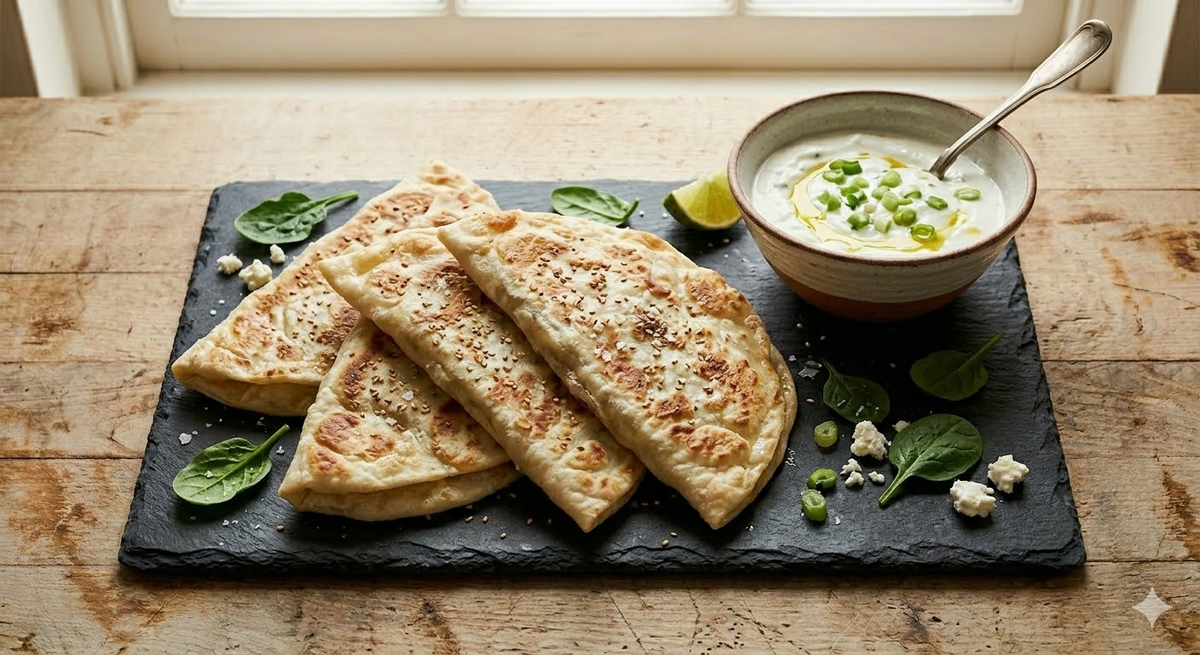 В тот момент я решила: обязательно научусь готовить это дома. 💡 Маленький секрет: можно добавить щепотку сушёного мяты — вкус станет более аутентичным 🌿 1) Сначала готовим тесто: смешиваем муку, воду, соль и 1 ст. ложку оливкового масла. Замешиваем мягкое, эластичное тесто и оставляем его отдыхать на 20 минут. 2) Пока тесто отдыхает, готовим начинку: шпинат мелко нарезаем, фету разминаем вилкой, добавляем зелёный лук и специи. Всё тщательно перемешиваем. 3) Разделяем тесто на 4 шарика и