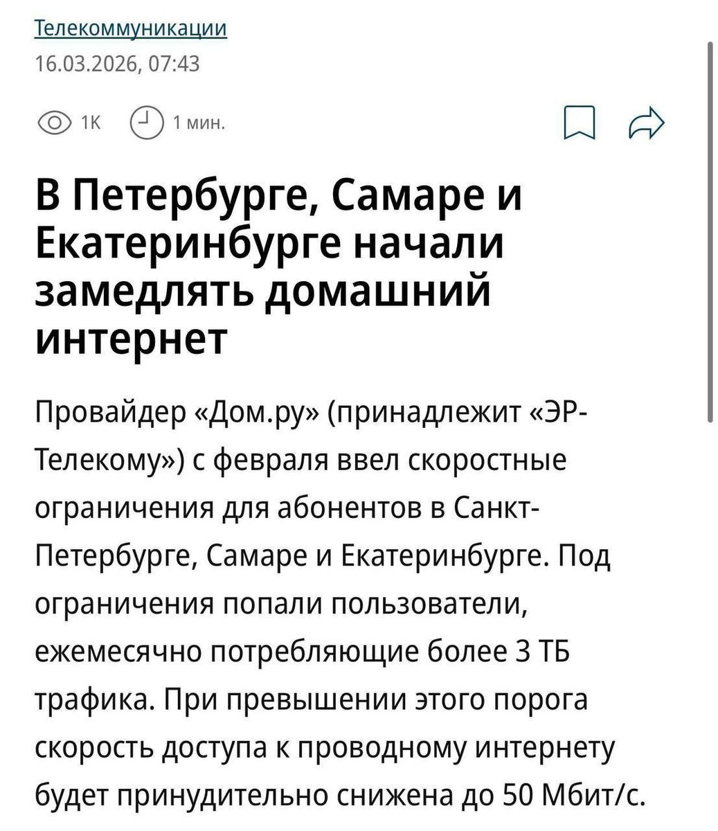 В Санкт‑Петербурге, Самаре и Екатеринбурге провайдеры снижают скорость до 50 Мбит/с, если пользователь тратит больше 3 ТБ трафика в месяц.