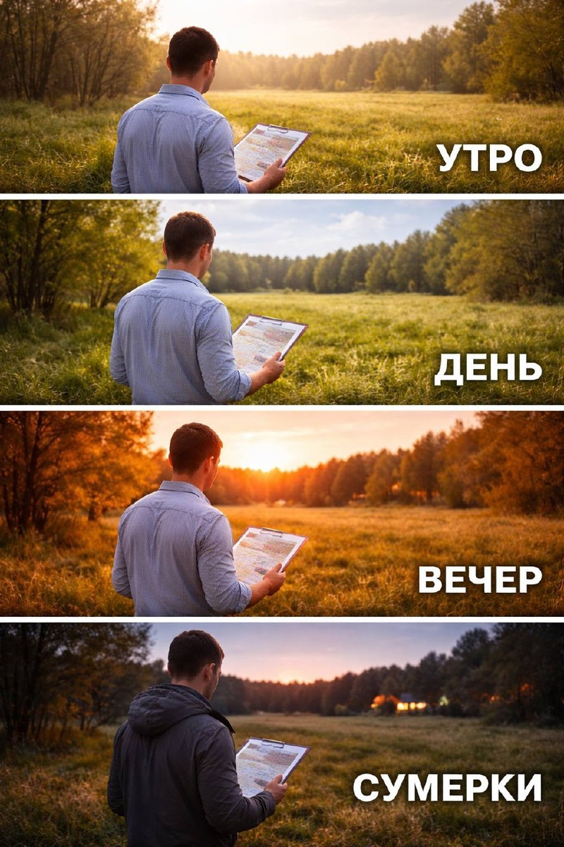 Даже если участок хороший, время осмотра может сильно повлиять на ваше впечатление. Лучшее время для осмотра участка — с 10:00 до 14:00. В это время: • хорошее естественное освещение • видно реальные границы участка • легче оценить рельеф • можно понять, где солнечная сторона и где тень. Утром и вечером длинные тени могут искажать восприятие территории. Также полезно иногда приехать два раза: • один раз днем • второй раз ближе к вечеру. Это позволяет увидеть: • уровень шума • движение транспорта • активность соседей • освещение территории. Интересно узнать ваше мнение: в какое время дня, на ваш взгляд, лучше всего выезжать на осмотр земельного участка?