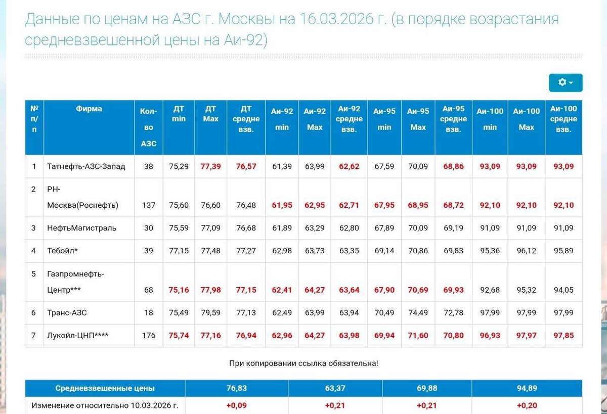 Самое сильное подорожание топлива за неделю. Цены на бензин на заправках Москвы и области ускорили рост. По данным Московской топливной ассоциации на 16 марта, средняя цена АИ-92 — 63,37 рубля за литр (+21 копейка за неделю), АИ-95 — 69,88 рубля. Подорожание ввели все крупные нефтяные компании. Частные АЗС цены не меняли. С начала марта бензин рос по 1–2 копейки в неделю, в феврале — по 11–15 копеек. За февраль литр подорожал примерно на 40 копеек. Больше интересных новостей в 📲 max.ru/newgrad_pavlino ⚠️НОВОЕ ПАВЛИНО 🆕🆕🆕🆕🆕🆕✅ Прислать новость|Подписаться ❤️
