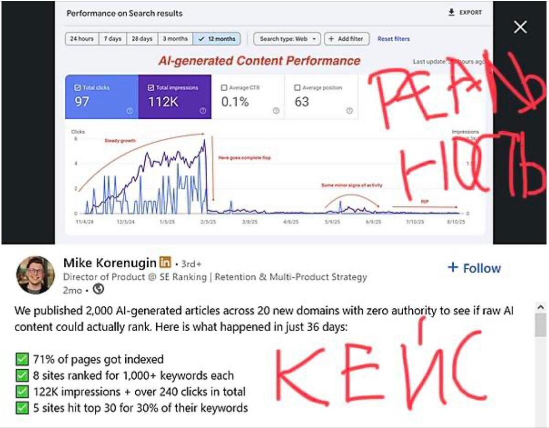 Помните красивые истории про тысячи статей, сгенерированных AI? Эксперимент выглядел мощно: - 20 новых доменов без авторитета - 2000 AI-статей - быстрый рост в Google Через 36 дней в кейсе всё выглядело почти как победа: ✔ 71% страниц проиндексировано ✔ 8 сайтов ранжируются по 1000+ ключей ✔ 112k показов ✔ первые сотни кликов Отличный материал для: • постов в соцсетях • докладов на конференциях • продажи услуг по «AI-SEO» А потом произошло то, что редко попадает в презентации. Трафик просто обрушился. График выглядит максимально показательно: 1) быстрый рост 2) короткое плато 3) резкое падение почти до нуля То есть сайт сначала получает алгоритмический кредит доверия, а потом Google начинает дооценивать реальное качество. И если под капотом: - пустые тексты - отсутствие экспертизы - нулевая ценность алгоритмы спокойно возвращают сайт к его настоящему месту. Именно поэтому в реальных проектах работает комбинация: AI → ускоряет производство SEO → строит структуру экспертиза