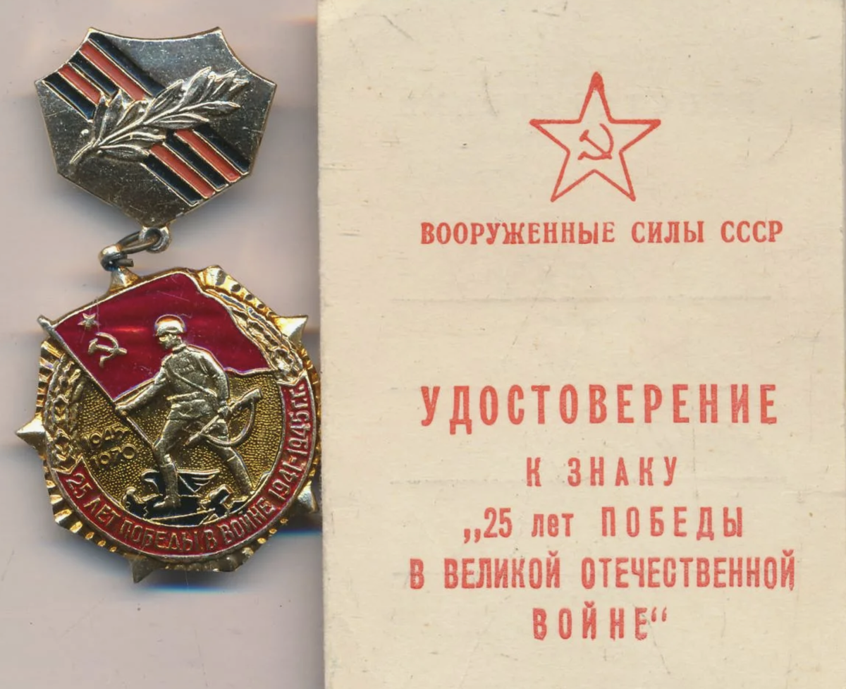 17 марта 1970 года Приказом МО СССР № 59 был учрежден Нагрудный Знак 25 лет Победы в Великой Отечественной Войне Мысль об учреждении памятной наградной медали в честь 25-ти летия Победы родилась в недрах МО СССР. Разработка ее эскиза была поручена художнику Техкома ГИУ МО СССР А.Б. Жуку. Первоначально это должна была быть медаль на пятиугольной колодке. При дальнейшем рассмотрении этого проекта в вышестоящих инстанциях и просчете затрат на это мероприятие возникла масса возражений. Поэтому решило ограничиться не медалью (хотя «пробники» уже успели изготовить), а знаком, применив для большей части тиража легкий, более дешевый металл.