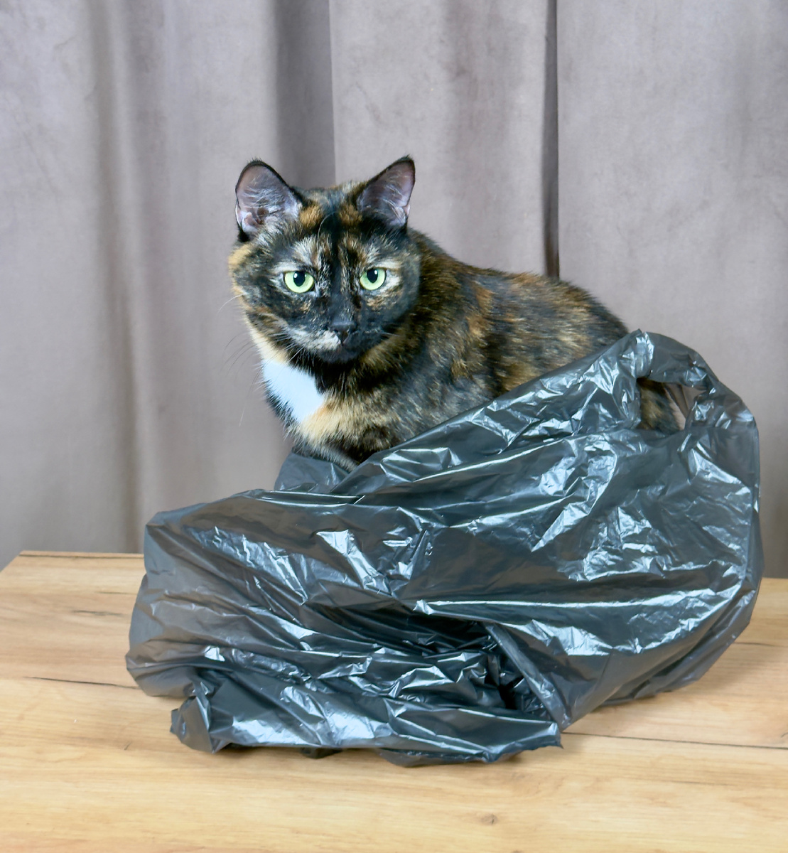 Она обожает забираться в пакеты, сидеть там довольная, громко мурлыча, и чувствовать себя в полной безопасности. Её привлекают не только свежепринесённые