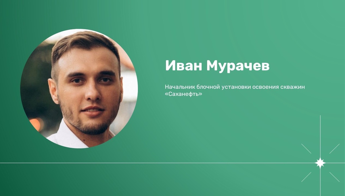 Иван Мурачёв — яркий пример эффективного функционирования «карьерного лифта» в компании. Начав трудовой путь после окончания профильного вуза в качестве оператора УПН на Ярактинском месторождении, он в короткие сроки занял позицию инженера-технолога и был зачислен в кадровый актив. К моменту завершения обучения в Инженерной школе Иван уже занял должность начальника блочной установки освоения скважин №1 на Маччобинском месторождении.