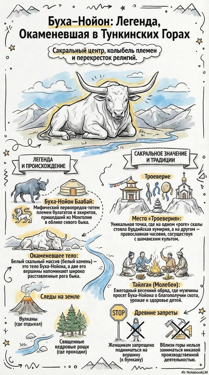 Буха-Нойон — сакральное сердце Тункинской долины и первопредок племен булагатов и эхиритов. По легенде, он пришел из Монголии в облике могучего сивого быка. 📍 Главные факты: ⚪ Окаменевшее тело. Белый скальный массив — это тело Буха-Нойона, а две его вершины напоминают широко расставленные рога. Следы его пути остались в виде священных рощ и вулканов. ⛪️ Место троеверия. Уникальная точка, где веками мирно сосуществуют шаманский культ, буддийская кумирия и православная часовня. 🔥 Традиции. Ежегодно здесь проводят весенний Тайлган, прося божество о благополучии и здоровье детей. 🚫 Запреты. Женщинам нельзя подниматься на вершину к бумкану, а вблизи горы запрещена любая производственная деятельность. Это место требует тишины и глубокого уважения. Канал нашей студии https://t.me/chimitdorzhi_studio