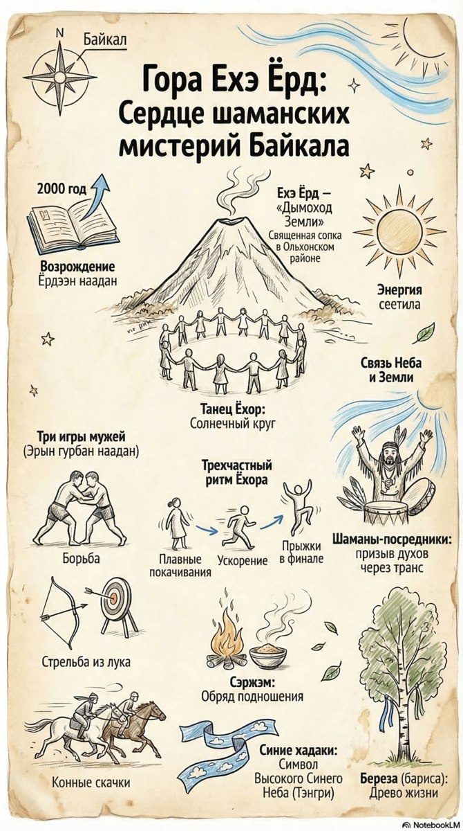 Ехэ Ёрд — священная сопка в Ольхонском районе, которую называют «Дымоходом Земли». С 2000 года здесь вновь проводят Ёрдынские игры (Ёрдын наадан) — великий праздник единения и силы. 📍 Ключевые элементы традиции: ⭕ Танец Ёхор. Солнечный круг, символизирующий связь миров. Его ритм включает три части: плавные покачивания, ускорение и высокие прыжки в финале, что наполняет участников энергией. 🏹 Три игры мужей. Состязания в борьбе, стрельбе из лука и скачках — это не просто спорт, а испытание духа и дань уважения предкам. 🌿 Духовные символы. Шаманы через транс призывают благодать божеств. Обряд Сэржэм, синие хадаки в честь Тэнгри и священная береза (бариса) как Древо жизни создают единое сакральное пространство. Ёрдын наадан — это мощный ритуал возвращения к истокам, объединяющий народы под Высоким Синим Небом. Канал нашей студии https://t.me/chimitdorzhi_studio