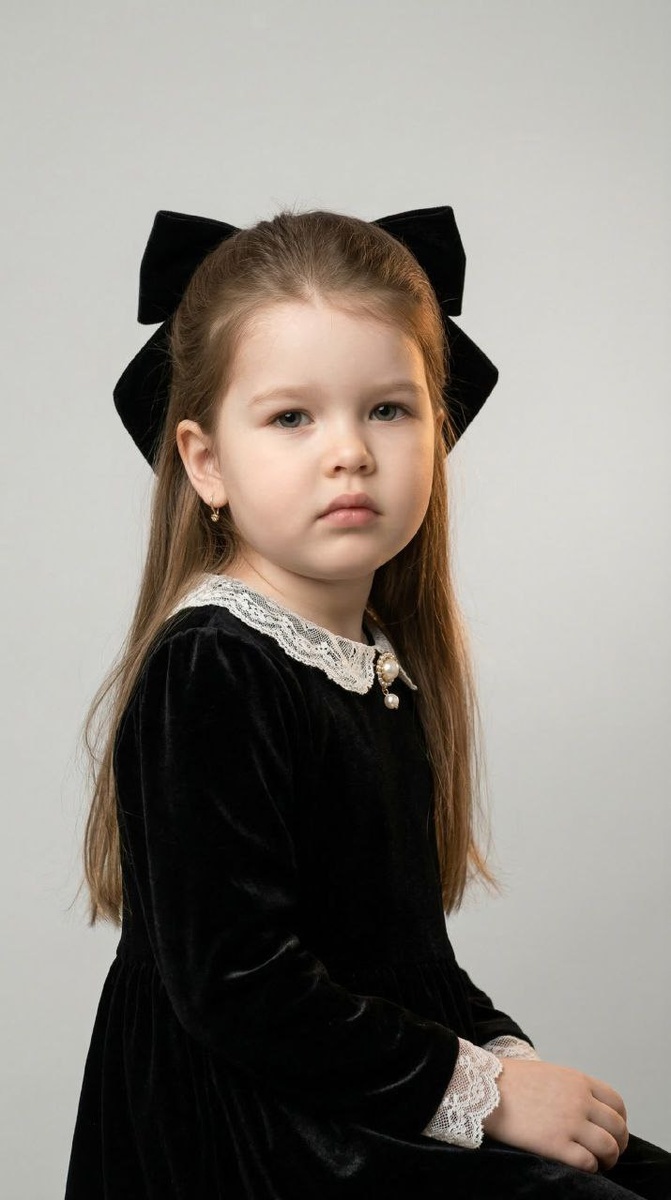 ❕Делаем в NanoBanana PRO Не меняй внешность ребенка с фото. Портрет маленькой девочки в элегантном винтажном образе: сидит в три четверти, взгляд прямо в камеру, спокойное невозмутимое выражение лица; она в чёрном бархатном платье с белыми кружевными манжетами и жемчужной брошей у воротника, большая чёрная бархатная лента-бант на распущенных волосах. Минималистичный студийный фон — мягкий молочно‑серый градиент без отвлекающих деталей, немного больше пустого пространства справа от модели. Мягкое рассеянное студийное освещение с крупного софтбокса слева‑переди, лёгкий контровой блик сзади‑справа для выделения прядей волос и текстуры бархата, деликатные тени под подбородком для глубины; натуральные тёплые оттенки кожи, низкая насыщенность фона, подчёркнутый контраст и бархатистая текстура ткани. Стиль: классический редакционный детский портрет, тонкая ретушь, слегка кинематографичная и живописная обработка, тонкий зернистый эффект плёночной эстетики. Камера/параметры: эквивалент 85мм, f