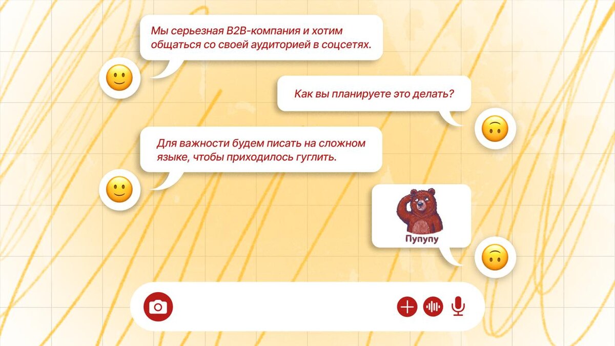 Золотое правило здесь: Коммуникация должна быть максимально простой, понятной и живой. Мы общаемся с людьми, а не с машинами. Человек приходит в соцсети отдыхать, а не разбираться в сложных текстах. Если мысль сформулирована просто, то цель достигнута: вас прочитают, запомнят. А при большом везении — выполнят целевое действие. Все это дает ту самую прозрачность — ключ к тому, чтобы ваш бренд стал видимым и близким аудитории. Сложные термины и перегруженные фразы — это скорее фильтр, который будет отталкивает. Хиханьки да хаханьки — то, ради чего в соцсети приходит большая часть аудитории. Остроумный мем или жизовая ситуация — способ выделиться из потока информации. Соцсети базово воспринимаются как пространство для отдыха. Если у пользователя возникнет потребность в сложных текстах, то он целенаправленно найдет ресурс по своему запросу.