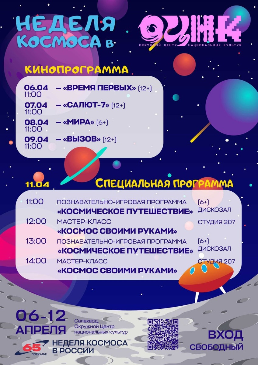 ! 🌟 С 6 по 12 апреля приглашаем вас в большое космическое путешествие, не покидая Салехарда! Приготовьтесь к захватывающим фильмам, творческим мастер-классам и познавательным программам для всей семьи. Будем исследовать Вселенную вместе! 🎬 Кинопрограмма Каждый день в 11:00 погружаемся в атмосферу реальных космических историй (вход свободный): 🔹 06.04 – «ВРЕМЯ ПЕРВЫХ» 🔹 07.04 – «САЛЮТ-7» 🔹 08.04 – «МИРА» 🔹 09.04 – «ВЫЗОВ» 🚀 Специальная программа 11 апреля (по заявке) ⏰ 11:00 – Познавательно-игровая программа 🎨 12:00 – Мастер-класс ⏰ 13:00 – Познавательно-игровая программа ✂ 14:00 – Мастер-класс «Космос своими руками» Принимаем коллективные заявки. Чтобы организовать посещение для вашей группы, заполните форму по ссылке.