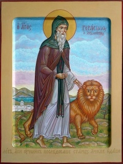 — Преподобный Герасим скончался мирно, оплаканный братией и учениками. До самой кончины преподобному Герасиму помогал в трудах лев, который по смерти старца умер на его могиле и был зарыт близ гроба святого. Посему льва изображают на иконах у ног преподобного.