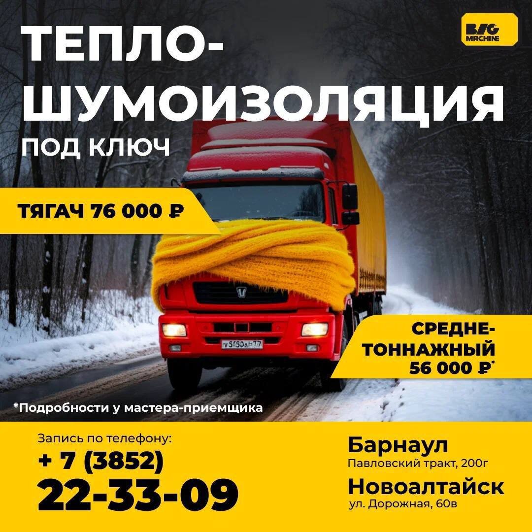 👇🏻 🔘 Шумо- и теплоизоляция грузовиков: ▪️ Тягач — 76 000 ₽ ▪️ Среднетоннажный грузовик — 56 000 ₽ После работ вы почувствуете разницу сразу: ☑️ Тишина в кабине и меньше усталости за рулём; ☑️ Комфорт в любую погоду — и в мороз, и в жару; ☑️ Снижение расхода топлива и экономия времени. 🔥 Сейчас действует акция — можно записаться по спеццене 📞 +7 (3852) 22-33-09 📍 Мы находимся: 🟡 Барнаул, Павловский тракт, 200г 🟡 Новоалтайск, ул. Дорожная, 60в А вы уже делали шумоизоляцию? Как изменились поездки — стало легче работать? Напишите в комментариях 👇🏻