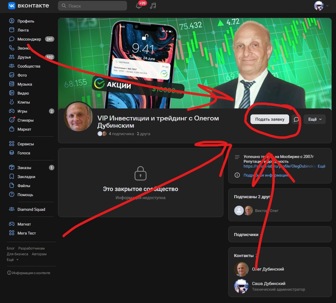 , в закрытом сообществе ВКОНТАКТЕ, 22 человека. В 12 раз меньше, чем в VIP Telegram Есть заявки, которые пока не принял, т.к. не могу их идентифицировать - не отправили ссылку на профиль Для вступления в сообщество, 1. 1.1 cкиньте платёжку и название тарифа, 1.2 ссылку на свой профиль ВК в личку Telegram https://t.me/OlegDTrader или на мою почту OlegTradingChannel@yandex.ru 2 Отправьте заявку в сообщество по ссылке https://vk.com/olegtrading Нахожу Вас ВКОНТАКТЕ по Вашему адресу (профилю) ВК (https://vk.ru/id...) Информацию отправляйте в личку Telegram https://t.me/OlegDTrader или на мою почту OlegTradingChannel@yandex.ru Особенность ВК в том, что новые подписчики не видят историю, только описания тем, закреплённые сообщения и все сообщения после вступления Вся история есть в Telegram Бот для работы в Telegram https://t.me/OlegTrading_Bot Можно подписаться через бота - больше тарифов, в т.ч. промо Всех подписчиков VIP чата Telegram бесплатно добавляю в ВК, дублирую свои посты из VI