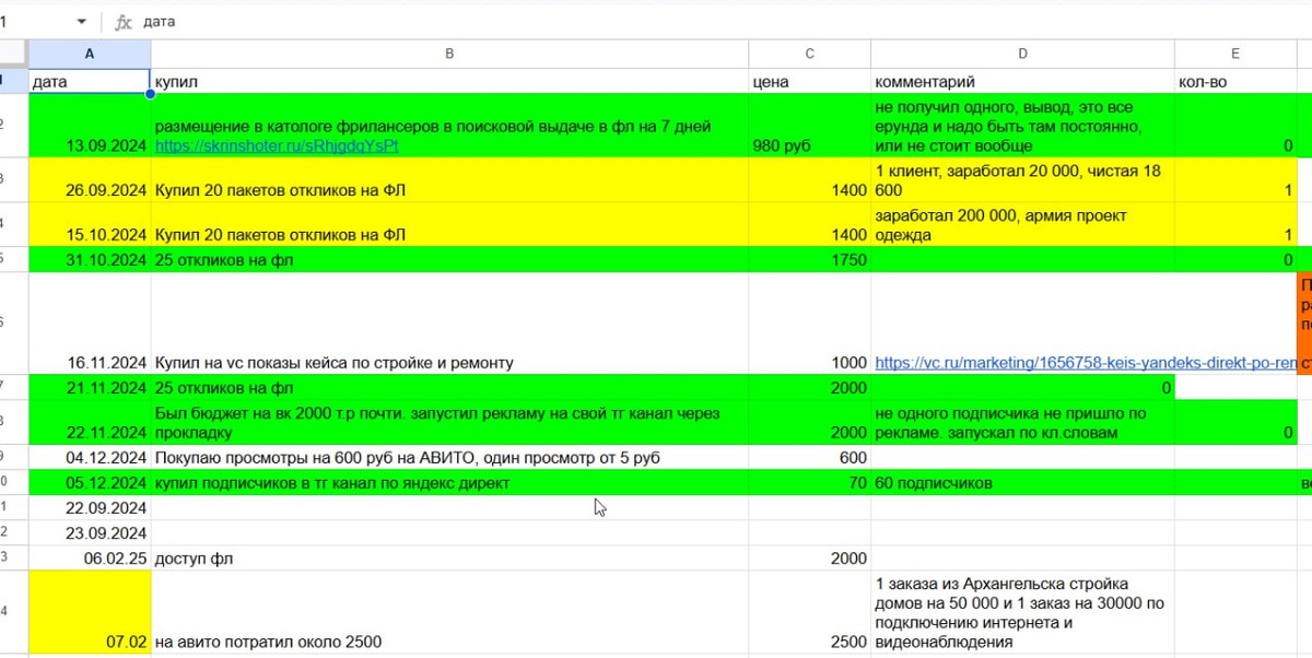 Где покупаю и куда вкладываю деньги, что бы получать клиентов 🔹Авито, пополняю от 1 до 2 т.р в месяц и хватает, если принесло заявку, отмечаю что этот канал принес одну заявку. 🔹Биржа ФЛ, что бы там откликаться, нужно покупать платные тарифы, в среднем за 30 откликов, стоит 2400 руб, если пришла заявка, так же отмечаю и сколько заработал с данного канала 🔹Кейсы на VC - просто написать на VC кейс не прокатит, если у вас только там нет много подписчиков, от 500 и выше, если ниже, то лучше сразу покупать платную рекламу. Так по любой активности по вложениям записываю в данную таблицу, таблица максимальная простая и после каждой покупки, записываю вложения и что это мне дало и стоит ли в этот канал вкладываться. Столбцы 🔺Дата 🔺Купил, то есть что и где купил 🔺Цена 🔺Комментарий, Тут пишу что это мне дало в перспективе 🔺Кол-во, сколько раз купил