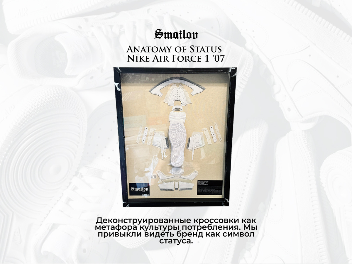 Объёмная работа, созданная из реальных кроссовок Air Force 1, Jordan 1 с полной разборкой конструкции под интерьер в индивидуальном и неповторимом дизайне. Каждый фрагмент — это анатомия желания: швы, слои, пена, подошва — то, что обычно скрыто внутри. Цена: 55.000 руб Каждая работа создаётся из оригинальной пары культовых кроссовок и собирается вручную в формате Sneaker Anatomy. В стоимость входит: Каждый объект создаётся вручную и является уникальной коллекционной работой. Это объект, который притягивает взгляд и становится точкой для фото. Обсудить проект - https://vk.com/marbl44