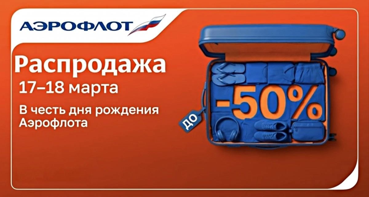 Распродажа "Аэрофлот" ко Дню Рождения авиакомпании! 😐 ✨Даты: 17-18 марта ✨Скидка: до -50% ✨Более: 500 000 билетов в классе Эконом ✨100+ внутрироссийских и международных направлений Вылеты с 18 марта 2026 года по 7 октября 2026 года Покупайте авиабилеты по акции, а мы подберём для Вас путешествие мечты! 👨💻 ⌨️Тел. + 7 812 2059502 🔑Ул. Марата, д. 9, оф. 1, Санкт-Петербург meteors.ru 📱 Внимание ! Наш новый канал - в MAX Подпишитесь, чтобы оставаться в курсе наших новостей