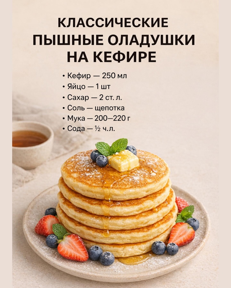 Смешать все ингредиенты до густого теста. Жарить сразу, не перемешивая тесто перед каждой порцией — так оладьи будут пышнее.