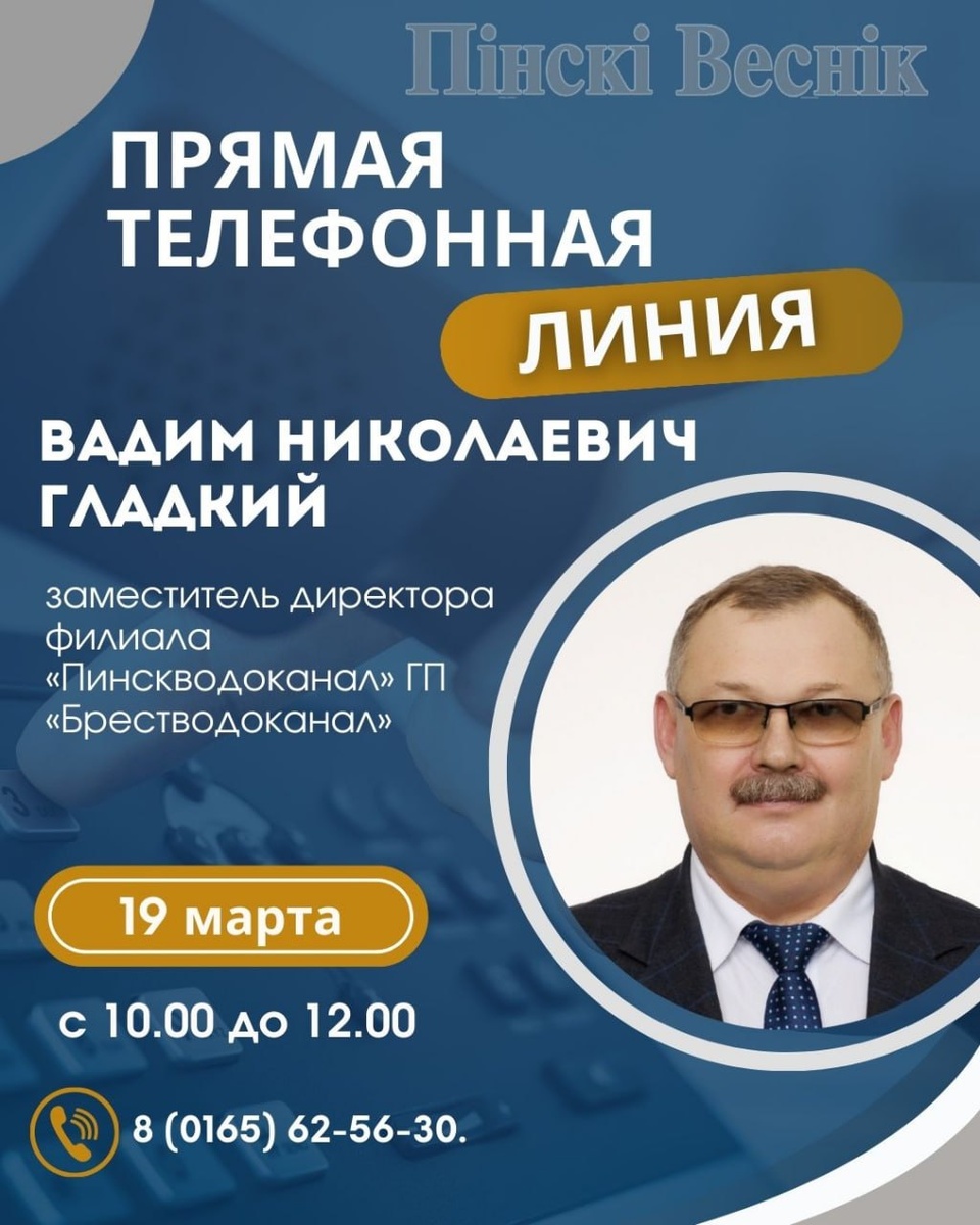 19 марта с 10.00 до 12.00 прямую телефонную линию проведет заместитель директора филиала «Пинскводоканал» ГП «Брестводоканал» Вадим