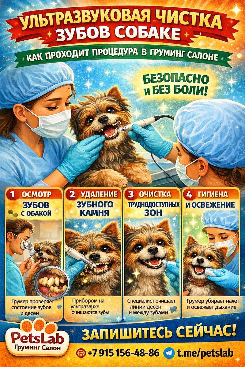 Многие владельцы собак слышали об ультразвуковой чистке зубов, но часто откладывают процедуру. Главная причина — страх и неизвестность. Хозяева переживают: будет ли собаке больно, как она перенесёт процедуру, безопасно ли это вообще. На самом деле ультразвуковая чистка — это современный и безопасный способ удалить зубной камень и сохранить здоровье зубов питомца. В хорошем груминг салоне процедура проходит спокойно, аккуратно и максимально комфортно для животного. Разберём пошагово, как проходит ультразвуковая чистка зубов у собаки. Со временем на зубах собаки образуется налёт. Он состоит из остатков пищи, бактерий и минеральных веществ из слюны. Если налёт не удалять, он постепенно превращается в твёрдый зубной камень. Именно он становится причиной: Поэтому регулярный гигиенический уход за полостью рта — важная часть заботы о здоровье собаки. Процедура всегда начинается с осмотра. Опытный грумер внимательно проверяет: Также специалист оценивает поведение собаки и её реакцию на прикосн