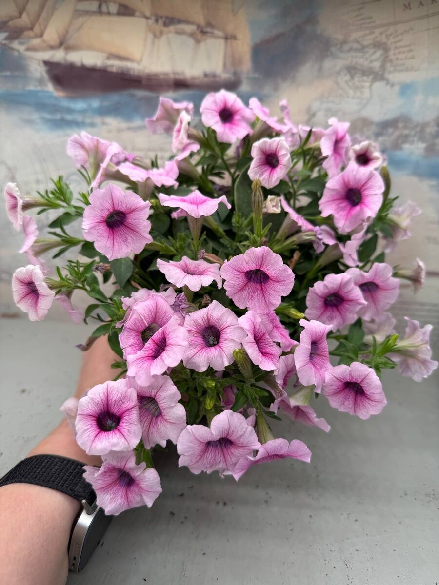 Сегодня у нас красавица Петуния Shock Wave Pink Vein (кустику на фото 1,5 месяца в 1 литре) — по-русски обычно пишут Шок Вейв Пинк Вейн. Это ампельная/каскадная петуния из серии Shock Wave. Серия Shock Wave выведена селекционной компанией PanAmerican Seed (США). Это часть большой линейки Wave (Вейв) — первой массовой серии стелющихся петуний, сделавшей «ковровые» и ампельные посадки популярными. Shock Wave — это «улучшенная компактная версия» Wave, адаптированная именно под кашпо и балконы. Цвет: розово-лавандовый фон + тёмные прожилки + тёмный центр. Цветок: небольшой (≈3–5 см), но их ОЧЕНЬ много. Высота: ~18–25 см. Разрастание: 50–80 см каскадом. Тип роста: ампельный, формирует плотную “шапку + каскад”. 👉 поэтому серия Shock Wave часто используют в городском озеленении 👉 поэтому её любят даже новички.