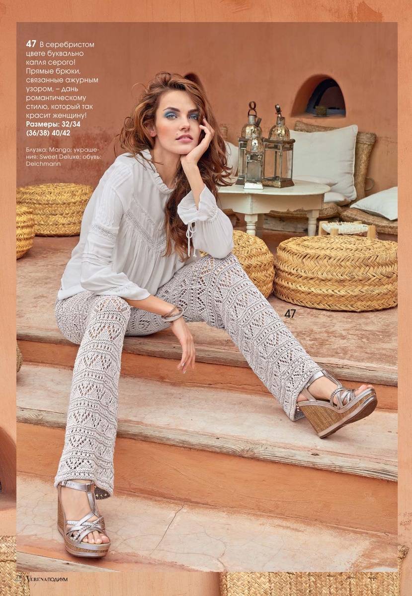 МОДЕЛЬ 47 Ажурные брюки Размеры: 32/34 (36/38) 40/42 Вам потребуется: пряжа (40% вискозы, 30% хлопка, 20% льна, 10% полиамида: 125 м/50 г) - 450 (500) 550 г серебристо-серой; спицы № 5,5; круговые спицы № 3,5; 2 чулочные спицы № 4,5: две блочки диаметром 8 мм; английская булавка. Резинка (спицы № 3,5): попеременно 1 лицевая, 1 изнаночная. Ажурный узор (спицы № 5,5): количество петель кратно 10 + 1 + 2 кром. Вязать по приведенной схеме. На схеме даны только лицевые ряды, в изнаночных рядах петли и накиды провязывать изнаночными или как указано. В ширину начинать с кром…, повторять раппорт. заканчивать петлей после раппорта и кром. В высоту выполнить 1 раз с 3-го по 18-й р., затем повторять с 1-го по 18-й ряд. Плотностьвязания: 20п.х27р. = 10x 10 см, связано ажурным узором; 33 р. = 10 см, связано резинкой. Левая половинка: набрать 83 (93) 103 п. и 1-й р. (= изн. ряд) провязать лицевыми. Работу продолжить ажурным узором. Через 68 см = 183 р. (70 см = 189 р.) 70 см = 189 р. от наборного ря