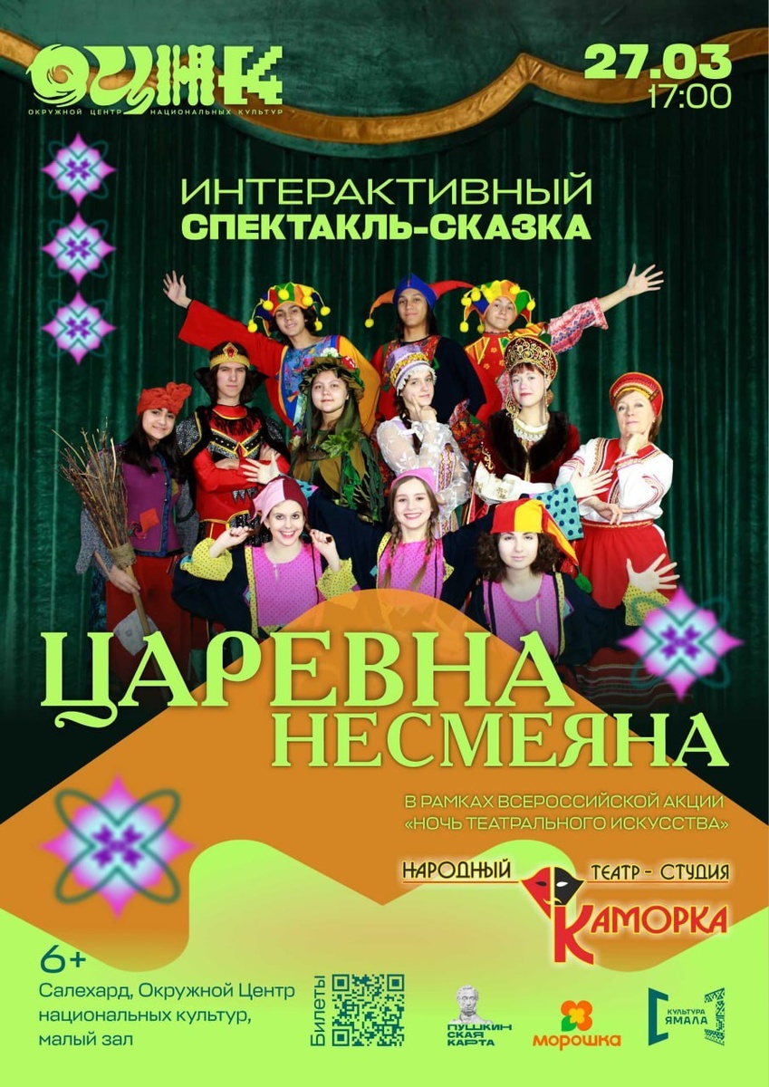 ! Друзья, по многочисленным заявкам зрителей театр-студия «Каморка» снова сыграет спектакль «Царевна Несмеяна»! 🎉 Вместе с любимыми героями вы отправитесь в захватывающее приключение, полное загадок, забавных ситуаций и неожиданных поворотов, чтобы вернуть царевне ее сияющую улыбку и отличное настроение. 🌟 Когда: 27 марта в 17:00 📍 Где: Окружной Центр национальных культур 🎫 Билеты доступны по ссылке: clck.ru/3SZR7z, по Пушкинской карте или через сервис «Морошка» со скидкой 20% Успейте окунуться в эту добрую и веселую историю! Ждем вас всей семьей!