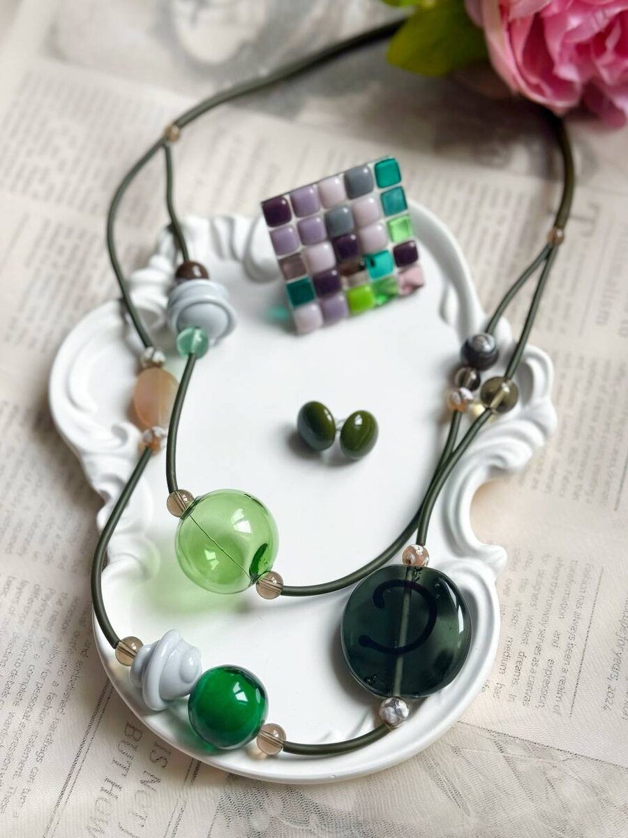🌱 Эту весеннюю подборку сделали стилисты — и это чувствуется. Здесь нет жёсткой пары «носить только вместе». Здесь про свободу. Про то, как сегодня вы выбираете тёмно-зелёный акцент, а завтра — что-то фиолетовое. Гладкие сферы из муранского стекла играют светом и глубиной оттенков — от прозрачной свежей зелени до насыщенного хвойного. Мозаичный акцент добавляет характер, а маленькие овальные серьги собирают образ, не перетягивая внимание.💚 Колье 6600 Кольцо 3570 Серьги 1050 ✨Нажмите для заказа ✉️ Нажмите чтобы задать вопрос