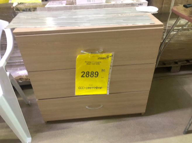 Комод с тремя ящиками. Он выполнен из ЛДСП, размеры 80×76×42 см. Есть два цвета — сонома и белый. Россия. Цена 2889 рублей.