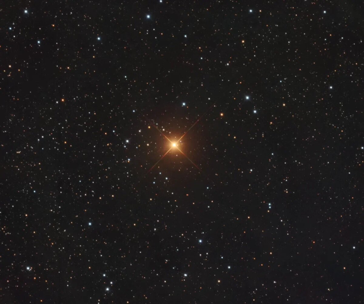 В созвездии Цефей есть одна очень примечательная звезда. За свой необычный глубокий красный цвет она получила название Гранатовая звезда или Garnet Sidus. Реже встречается название Эракис (Erakis). «Как прозрачная капелька крови, сияет в глубине небес это красное солнце – самая красная из всех ярких, доступных невооружённому глазу звёзд» - так описал её известный советский популяризатор науки Феликс Зигель. Фотография, хотя и позволяет видеть больше подробностей, не передаёт тех ощущений, что можно получить при живом визуальном наблюдении в небольшой телескоп или бинокль под тёмным небом. По контрасту с соседними белыми звёздами Гранатовая действительно удивляет своим цветом! Красная – значит холодная. Температура внешних слоёв μ Цефея составляет всего около 3700К – очень мало по звёздным меркам. Для сравнения: температура видимой поверхности Солнца почти вдвое выше – 5780К. А это значит, что каждый квадратный метр поверхности Гранатовой звезды излучает в шесть раз меньше энергии. При