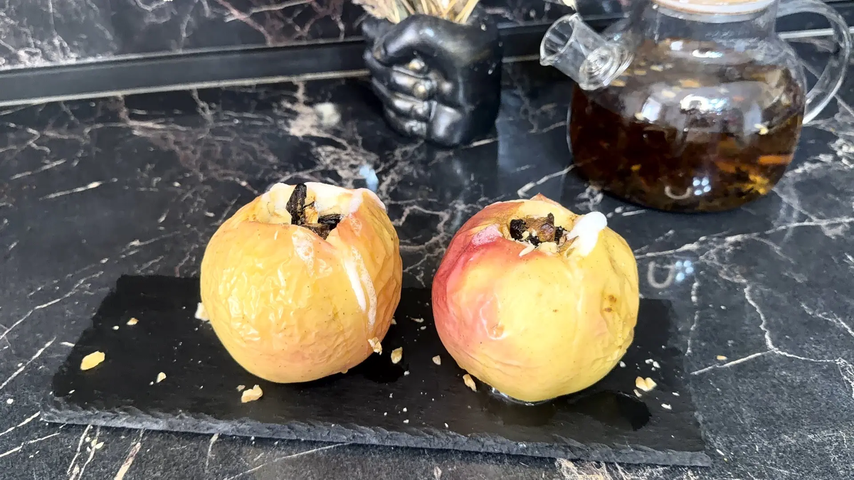 Позвольте предложить вам несложный рецепт потрясающих запечённых яблок, которые прекрасно дополнят домашний вечер или послужат отличным десертом. Нежность и восхитительный аромат делают это блюдо любимым даже среди самых взыскательных гурманов. Итак, приступим к моему испытанному рецепту: Необходимые ингредиенты: - Свежие твердые яблоки — 4 штуки - Очищенные грецкие орехи — 50 грамм - Чернослив без косточек — 80 грамм - Натуральный жидкий мёд — 2 столовых ложки - Молотая корица — пол чайной ложки Процесс приготовления: 1. Начнём с подготовки яблок: хорошо промоем фрукты и аккуратно извлечём сердцевину, стараясь оставить стенки целыми. 2. Переходим к созданию начинки: измельчим грецкие орехи и нарежем чернослив небольшими кусочками. Соединяем компоненты с мёдом и немного присыплем корицей, получится соблазнительная масса. 3. Получившейся смесью аккуратно заполним вырезанные яблочные полости, распределив начинку равномерно. 4. Предварительно нагреем духовой шкаф до температуры 200 град